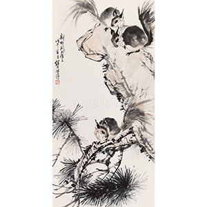 刘继卣自幼秉承家学研习绘画,入学时又师从油画家刘凤虎、津门画派陈少梅学山水及人物画,解放后在北京从事连环画创作,是北方连环画的重要代表画家。多年的连环画创作经验以及少年动物写生的经历,使得刘继卣的动物画生动有趣,在造型栩栩如生的同时,又注入了拟人化的感情,因而雅俗共赏。这幅刘继卣的《松鼠图》,以大写意的笔法绘就三隻嬉戏于岩石和松树上的松鼠。画家以水破墨,绘出松鼠身体,表现其身体蓬鬆与柔软的质感,虽是湿墨堆就,却富有浓淡变化,在写意的基础上又以干笔撕扫出松鼠尾巴炸开的长毛,格外准确生动。在松鼠面部的刻画上,浓墨精心画其炯炯有神的眼睛和立起的双耳,繁简对比,