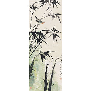 作为海上画派重要的花鸟画家,中国“新花鸟画派”的代表,唐云的花鸟画颇具个人面目。他的花鸟推崇自然天趣,追求明快俐落的画面节奏与秀逸明朗的色彩。这幅《竹雀图》正是唐云1960年五十岁正值壮年的作品。画面中几竿翠竹斜穿而出,竹叶偃仰之间如被清风拂动,轻盈俊逸,又如同缀满了露水,而微微下垂,在逸笔草草之间生动地描绘出了竹叶滴沥、潇潇而动的润泽之感。画面下方三根竹笋破土而出,画家以飞白的笔墨表现了笋箬粗糙的质感,又彰显出竹笋生长迅捷旺盛的特点,可谓生动准确。而跃动在竹枝上的一隻雀鸟正欢快鸣唱,为画面增添了活泼的精神。逸笔的竹与小写意的鸟呼应对比,真可谓天趣盎然。唐云有言:“我希望自己的画也能如这些药草(竹子、芦根)一样,也能给人一点疗效或滋