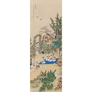 谢之光的这幅《弄玉吹箫图》与传统表现弄玉在高台上吹箫引凤的主题稍有所不同,而是一处更为閒逸、安适的场景:搭好的绿篱形成了天然的矮墙与拱门,为古代的名媛淑女们围绕出一方与外界喧嚣隔绝的小小花园,她们在草地上铺好石青色的地毯,席地而坐,或是鸣笙或是吹箫,或是静静地欣赏著动听的乐曲。而花园的角落里,则安置著石质的条案以及木製的花几,其上陈设著水盛、茶壶、香炉、手卷等文房雅物,又有红漆铜製鹦鹉架,架上安置了一隻鹦鹉,几位稚童在花园中追逐嬉戏,拱门处两位风姿绰约的仕女正相携而入,似乎为音乐声所吸引。