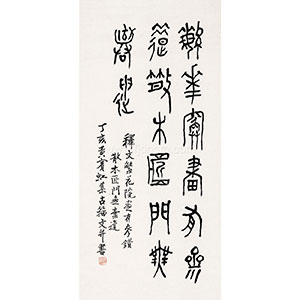 黄宾虹曾经说过:“我习篆书是从金石古玺名刻入手,从刀书的清刚悟出杵书笔法浑厚之风,行笔多变,八面有锋。”因此他的篆书古拙浑厚,颇有金石韵味。此篆书为黄宾虹丁亥年(1947)所书,时年八十四岁,虽目力渐衰,然而笔力不减,气势非常。对联集古籀文“繁花院画有参错,散木匠门无弃遗”,此为黄宾虹极为喜爱的联句之一,浙江博物馆中亦收藏有黄宾虹1951年所书此联句,可作互参。