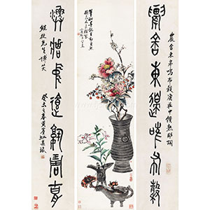 黄宾虹的篆书金石趣味尤为浓厚,且与吴昌硕等海派书家的篆书风味大相径庭,充满了独特的个人面目。这副黄宾虹所书集篆七言联,恰到好处地体现了黄宾虹篆书古拙浑厚的趣味。值得一提的是,此对联乃是黄宾虹于1943年赠予好友王鲲徒的作品。是年黄宾虹已八十高龄,笔法老到,古意盎然,金石趣味浓厚,其势沉雄如有千钧,却丝毫不板滞。1930年,黄宾虹筹办中国文艺学院时,王鲲徒曾给予了极大的帮助,并任学院董事,在此期间,王鲲徒与黄宾虹惺惺相惜,甚至曾经相约同葬杭州南山公墓,足见二人友情之深厚。这幅对联同样也是二人友情的见证。而与此对联同列一组的《花卉清供图》以色为主,以墨为辅,层层点染,正是其晚年花卉由清雅逐渐向浓丽沉实转变阶段的作品。从整体上看,设色穠丽而不俗艳,轻鬆随性的墨线与大胆鲜明的色彩相互呼应融合,形成了极具生命力的画面,白梅、牡丹、南天竹、百合、灵芝……种种折枝花卉随意插在全形拓的青铜彝器中,古老而永恒的青铜器与新鲜而短暂的花朵、斑驳的墨韵与明艳的色彩、写实的全形拓与写意的绘画相互辉映,别开生面,显得格外古雅,真可谓“流动之中有古拙,有静气”。其花枝用笔线条颇有隶意,刚健阿娜。黄宾虹曾说:“字贵写,画亦贵写。以书法透入于画,则画无不妙;以画法参入于书,则书无不神。”其书画互参,又融入金石趣味的风貌在这幅作品中表现地极尽分明,从中,我们也感受到了黄宾虹对于金石艺术的喜爱之情。值得一提的是,此作中的青铜器全形拓乃是黄宾虹弟子、著名女印人谈月色亲自手拓。