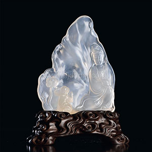 这枚坑头晶石材质通灵莹澈、晶透如水,甚至不必以灯照射,就可隔石视物。石体光水明澈,淨如琉璃,又以之刻慈悲观音,让人有“明镜本清淨,何处染尘埃”的直观联想。观音颜容婉丽,坐像庄严,胸配璎珞,双手拱于前,慈悲仁厚而又有母性光辉。童子双手合十,屈膝而跪,恭谨虔诚。观音、莲花、童子本就是体性最为纯洁、无染的象徵,与此石相得益彰。