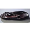 紫檀的牛毛纹较为直观,体现的是一种静态的美,而紫檀的水波纹则是另一种视觉效果。水波纹是紫檀表面一条条生长有序的纹路,在光线的映射下产生类似水波粼粼的光泽,一般只生长于紫檀接近表皮的那部分材质上面。有此等斑纹,则意味着紫檀的质地更紧实。