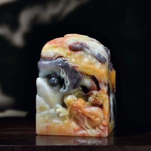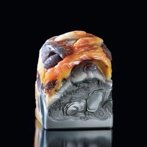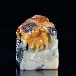 此五彩芙蓉石形制巨大,裁切端方,周身遍布白、黄、橙、红、紫多色,相互缭绕交织,华贵无匹。五彩芙蓉石乃是芙蓉石中格外珍罕的品种,以其色彩缤纷灿烂而夺目,如此端方巨大的形制更是罕见,作者巧妙地取其色彩斑斓之特点,借色取巧,在此方章上以浮雕、高浮雕、圆雕、镂空雕、陷地雕种种雕刻手法相互结合,营造出五彩祥云缭绕中五方神兽盘曲隐现的情景:顶部凤凰羽毛舒展,尾羽纤长飘动,长足挺直锐利,与柔软的羽毛形成了鲜明的对比。印身四面分别雕刻龙、虎、玄武与麒麟,与凤凰共同组成五灵兽,在取巧方面,以紫色刻虎,以黄色刻麒麟等等,都彰显出了作者极为高超的取巧造诣与构思,实为难能可贵的天人合一之佳作。