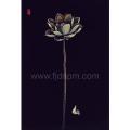 作者是在一面油光发亮的漆黑板面上画着一茎新荷从水中冲泥凌空而出,亭亭耸立,绽开了怒放的花瓣,清白娇妍,花内金晕得体;正是不须脂粉添颜色,恰如艳影出清漪,一股高逸秀爽之气荡漾于笔情光色之间,传写出富有生机物趣的自然形象,妙不可言。