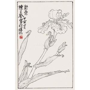 “紫燕”乃花卉日本鸢尾的别称,这幅《紫燕》乃是画家中年所作,画面不施色彩,纯以双钩白描绘成,虽无色彩,却将紫燕花开之风致表现得淋漓尽致,线条富有变化,充满了“金石气”:画叶片时用笔如刀,矫健有力,顿挫之间若铁划银钩,不仅描绘出叶片挺拔如剑般的气质,更细腻地表现出叶片边缘、尖稍的卷曲,极为自然,不仅体现出作者的深厚笔力,更体现出作者对于物象的细微观察和准确把握。而在花朵的描绘上,用笔则灵动有致,富有节奏感,突出花瓣柔软娇嫩的特质和迎风含露的情态。整件作品气韵典雅,用笔宛转自如,乃是白描花卉中的佳品。