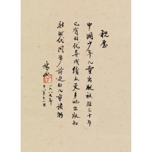 释文:祝愿中国少年儿童出版社在三十年已有的优异成绩上更多地出版和新时代同步前进的儿童读物。
