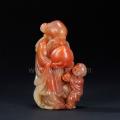 此石为红色善伯洞石,间有白色。作者以圆雕手法雕刻一老者与一幼童,作持桃献寿状,寓意吉祥。老者面目慈和,幼童活泼顽皮,动态如生,白色处理为老者的发带以及衣袂一角,颇见巧思。