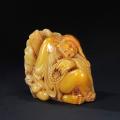 此石为黄色旗降石,色彩均匀明丽,颇为难得。以圆雕手法雕刻铁拐李酣睡图,姿态自然,表情闲适。铁拐李在民间传说中为八仙之首,据《续文献通考》记载:隋时人名洪水,小字拐儿,又名铁拐,常行丐于市,为人所贱。后以铁杖掷空化为龙,乘龙而去。