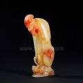 此石为红白二色芙蓉石,石质温润凝腻。作者利用俏色,将红色雕做人物头部,白色部分为身体,并以两只白鹅化去了部分杂色。“羲之爱鹅”为四爱图之一。传闻 王羲之喜爱养鹅,通过观察鹅的叫声和神态,逐渐融入其书法艺术之中李白有诗《送贺宾客归越》:“镜湖流水漾清波,狂客归舟逸兴多,山阴道士如相见,应写黄 庭换白鹅。”