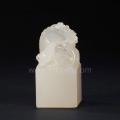 坑头石为水坑出产,质地通透凝结,极有灵性,有其他石种所不及的细腻光泽。这枚坑头石通体白色,纯洁灵秀,以平台圆雕刻鳌龙钮。鳌龙,又称鳌,龙头龟背麒麟尾,一说为龙生九子之一。这件鳌龙钮刀法流畅,动势十足,背上一只小鳌更为整件作品增添了生趣。