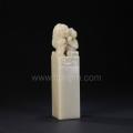 此石为浅灰色善伯洞石,通体纯净,毫无瑕疵,温润可人。纽式为平台圆雕古兽,雕刻母子狮戏球题材。母狮威武而不失慈和,两只幼狮活泼可爱,尽显孺慕之思。平台之下四面饰以汉画像砖风格车马纹饰,整体风格传统整饬而富有华丽的装饰风格。