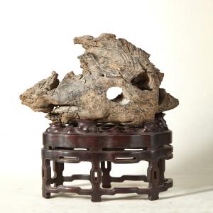 此石遍体褶皱,玲珑生巧。瘦中带皱,皱中有漏,漏中生透。四相相连,相得益彰。引李渔《闲情偶记居室部》之说:此通于彼,彼通于此,若有道路可行,所谓透也,石上有眼,四面玲珑,所谓漏也,壁立当空,孤峙无依,所谓瘦也。不失为古典赏石的典范。