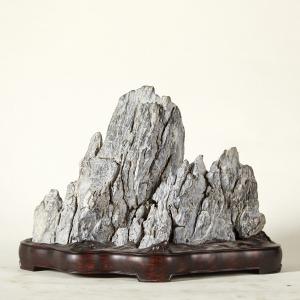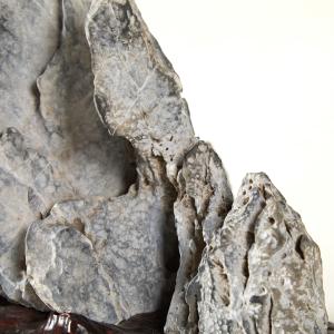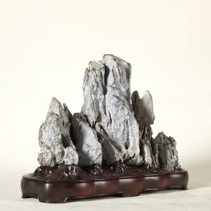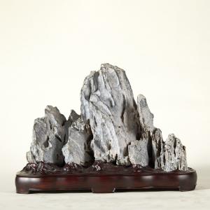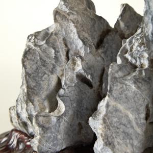 英石又称英德石,产于广东省英德市。英石具有悠久的开采和玩赏历史,宋代的《云林石谱》就有相关记载,早在宋朝已被列为皇家贡品,到清代更是被公认为四大名石之一。此英石宛如一障,拔然而起。色泽青灰。石理皱縠迭浪,岩窦纵横。犹如斧劈千仞,似海浪层层,大雪迭迭;又如春风吹碧水,微波滚滚,极具气势。底配红木底座,将自然之美与人造之美宛然合成。