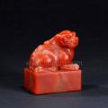此石材质为芙蓉石,遍体鲜红,华丽夺目。钮式为平台圆雕古兽钮,雕刻辟邪,姿态稳重大方,比例合宜,线条洗练。整个印章给人以简洁大方,古朴凝重的感受。