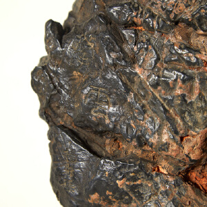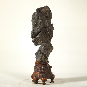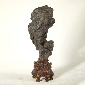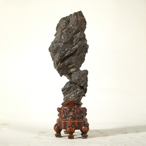 此灵璧石,沟壑顺长,裙折纹明显。其形廉棱锐刿如剑戟,枯干瘦挺,如古木一段,自下而上,自然律动,纹路若丝络般随山势扭转,至山腰处有一缺口若利刃斫处,顿觉其险,山形略收敛后顶部渐丰,沟壑相间。端险挺立,亭然秀耸,有入云之势。底配红木托,与石相之呼应,更显石之高古!