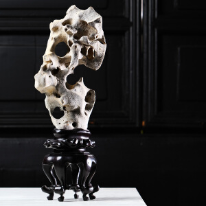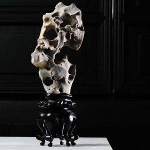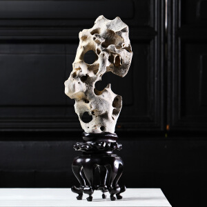 沟壑纵横,遍布皴皱,曲折幽微,引人入胜。扣之锵然有声,响韵悠扬,观此石,则顽、拙、丑、怪、灵、巧、秀、奇之美兼而有之,此物配红木座,实为清雅的案头清赏,太湖石为陈设始于宋代,在明清之际尤为盛行,是较为重要的文人陈设之物。
