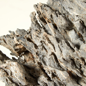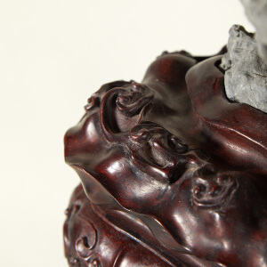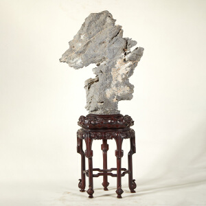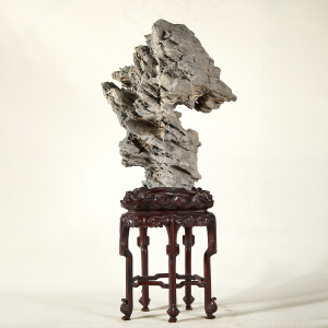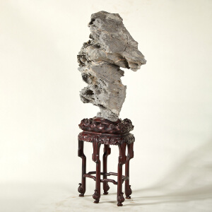此英石色泽青黑,质坚而缜密,表面奇崛多褶皱,间有深岰洞壑巉岩。石为立峰,有多面可观,突兀耸立,气势雄浑。峰顶尖突而呈斜势,有较大的裂隙沟壑,危岩突出,有欲断而下坠之险;中部宽阔,下部尖竪,呈橄榄形,中有透空贯穿巉岩孔洞,玲珑婉转,灵巧生姿,体现出皱、透之妙。整体造型犹如断壑绝壁,既有峰峦陡峭,又有砯崖转石,奇诡而多姿。拍品原配红木底座。