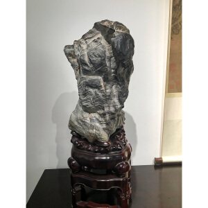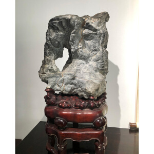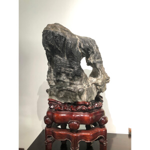此石座于红木二级座上,玲珑剔透,多面可视,似云卷云舒,灵飞若动,曲折盘绕,如伏若踞。包浆光湛莹朗,质如腊脂,温润如玉。变幻多姿,浑厚饱满,包浆浓郁,色泽白中泛黄。表面凹凸起伏,沟壑纵横,形似雾似云,正如古代文人所云“移石动云根”,石如烟霭云涛,吞吐变化,灵气十足,若置于书斋停室一隅,即得隐逸林泉之致