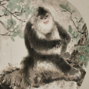 柳财顺喜爱猿猴,他的作品多以猿猴为题材,他曾经介绍说猿猴具有“机灵”“乖巧”“精明”“敏捷”“顽皮”“恋家”的特质,中国人赋予猴子许多美好的寓意。此件他的《雨余春晓》,画面中似乎空山新雨之后,一只猴乖巧坐在树枝之上,作者笔法细腻,猿猴毫毛毕现,通过层层丝毛晕染上色,营造有层次而又毛茸茸的质感。再观此猿猴的面目,似乎带着母猴所有的慈爱温和,惟妙惟肖,给人以丰富的内涵和无限的遐想,轻松地把观者带入画面中的世界。