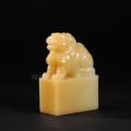 这件作品材质为芙蓉石,黄色由浅至深,淡淡氲开,温润洁净,凝灵可人。钮式为平台圆雕古兽钮,造型饱满,姿态自然,细节处刀法细腻,一丝不苟,但整体风格简洁,落落大方,为传统纽式中的典型之作。