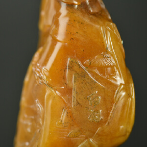 此件作品选用田黄石雕刻而成,质地温润如凝脂,宝光弥漫,萝卜丝纹隐现其中。作者郭卓怀以春江水暖为主题,循着田黄的天然色彩、纹理巧施技艺,在正面雕刻出柳树、山石、泛舟等景,线条浑厚且耐人寻味。背面则以“惜物”之心保留自然凹陷之处,顺应石势以枝叶弥补缺憾,增以牧童戏鹅之景,趣味天然。