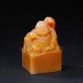 都成坑石,又称为都成坑石,石质结实晶莹,敲之响声铿锵如玉,光泽夺目,表里如一,永不褪色,质保永年。唯材大者甚少,佳者质与价均仅次于田 石。这枚都成坑石色泽金黄,华贵夺目,牛毛纹若隐若现,如暗花浮动,灵气逼人。钮饰为自然台圆雕人物钮,一人,一笔,一卷,名为“勤学”,但闲适之态,宛 然如生。