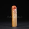 这件水洞高山石主题为白色,上部有点点桃花浮动,呈现出带有透明质感的水红色。作者在传统钮式的基础上加以创新,以“花开富贵”为题,与印章主 体部分浮雕牡丹枝叶,而在印章顶端红色花朵部分改用镂雕手法,将层层花瓣逐一呈现,使得作品整体流露出强烈的对比,花朵部位尤为醒目。
