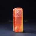 此石为红黄白三色高山石,质地莹澈凝结,颜色纯正鲜艳。为博古钮饰,四面仿汉代画像砖风格雕刻龙虎纹,古朴遒劲,端庄雅致。
