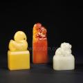 这三枚印章,一为白色,一为黄色,一为红黄相间,白者如凝脂,黄者如蜜蜡,红者如朱砂,俱温润纯净,颇值玩赏。钮式为传统风格的圆雕古兽钮,一为辟 邪,一为天鹅,一为双螭虎,造型饱满,刀法洗练。三者作为套章,既面目不同,各有风韵,同时流露出和谐的整体风格,为收藏精品。