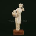 明末清初,福州就开始用象牙制作工艺品。清末,福州木雕艺人柯世仁等人创作的牙雕作 品,以浓厚的地方特色而享有名气。1958年福州木雕厂黄杨木雕组开始生产牙雕新旧人物、动物的圆雕作品,1962年,牙雕名艺人阮宝光以传统技法与现代 雕刻相结合创作的《走雨》、《回娘家》,把妇女形象刻划得细致入微、形神并茂而轰动艺坛,成为他的代表作品。此件象牙雕刻《回娘家》是阮宝光于67岁时创 作的作品。作者采用光洁明亮、牙纹细致的优质象牙,采取写实的风格,同时汲取了戏曲艺术的动态,生动地刻画出一位头戴鲜花,手提食盒的少妇形象,人物身段 优美,衣纹流畅,体态轻盈柔美。象牙材质的细腻光洁与女子的温婉妩媚相得益彰,令人怦然心动。表现了作者以传统技法和现代雕刻相结合,将一位含羞带喜回娘 家的新婚少妇刻画的栩栩如生,为作者的代表作之一。