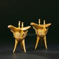 爵作为饮酒之器,早在公元前2400年左右就已经出现。陶爵流行于夏、商,青铜爵流行于商和西周,西周以后便罕见爵杯的踪迹了,到了秦汉时期便已消 亡。至宋,以古物为研究对象的金石学逐渐兴盛,才逐渐重新认识商周青铜爵杯的原始风貌,后世遂用各种材质进行仿古,如玉爵、瓷爵等。这两盏爵杯,为脱胎漆 器,仿商周青铜爵杯,口沿外撇,圆腹略深,前尖后翘,下承三高足,口沿两侧有对称的立柱,金碧辉煌,又见高古致趣,为当代工艺精品。