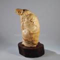 这件作品形状如笋,作者依形而就,保留了材质的大部分外皮,而取其中部分雕刻布袋和尚的头、胸部分。雕工朴拙中见精微,表情憨态可掬,动态自然,与材料天然形状和谐地融合在一起,有巧夺天工之妙。