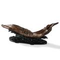 这件作品从一段沉香木的自然形态得来灵感,以写意“泛舟”为题,不求形状规整,但取其中神韵。作品以整段材质为江流,小舟于浪花翻卷的江中漂流,岸边草木繁茂,舟上四人神态轻松,任舟楫缓行,怡然自得,充满动感与自然生趣。