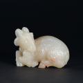 此善伯洞石质微坚,微透明,莹澈脂涧,质地细腻,质感极佳,石色白皙略带红花。圆雕羊躯,造型古朴雅致,屈身蹲坐、形象生动。吉羊谐音吉祥,故所作把件当寓意吉祥如意。