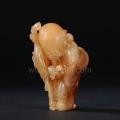 此雕件石形饱满,石质纯净,有着极好的通透感和凝润的光泽。作一老寿仙右手持仙仗,左手持寿桃,低头含笑,举步欲行之态。作品雕刻细腻到位,特别是须部和服装纹饰的雕刻显现了精湛的刀法,寿仙头部刻意夸张让人物的造型看起来诙谐有趣。