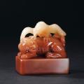 此件芙蓉所雕之英雄日字章,取鹰、熊相斗之谐音,质地脂润凝结,以黄红为主色调,疏朗润泽,巧色分明。