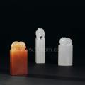 寿山坑头冻产自高山,古称“晶玉”,因石质透明凝结如同水晶而得名。此三印二为坑头白水晶冻,通体洁净透明,濯濯冰雪,澄澈心腑,质结而细,具“玉骨冰肌”之气质 ;一为高山石,呈红黄双色,娇艳妩媚,其质地细腻,属高山石中极上乘者。