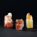 两枚为成都坑石正方章,质地细腻微透明,色泽洁白无瑕,凝润若脂;圆雕瑞兽钮,刻工精美。一为巧色芙蓉石正方章,红黄白相间,色彩绚烂娇艳欲滴。三印一红一白一黄,争奇斗艳,颇为难得。