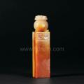 此件扁章切割齐整,章上有古纹修饰,材质坚硬通灵,温雅致密,稳重润泽,为都成坑石所作。作者以圆雕手法呈现雕以螭虎盘旋於上,神态自然,形象生动,刀法简约流畅,整体观之温和稳凝。