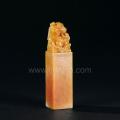 旗降石质地细腻脂润,微透明或不透明,富有光泽,年久不变,在寿山石中韧性最强。所刻螭虎戏钱钮古拙朴茂,与黄色旗降石相得益彰。