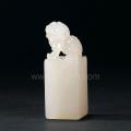 章为荔枝洞石,其色泽纯白皎洁、素雅含蓄,质地纯净微带透明,因石性较老故油质感极强;此枚方章的印钮雕刻采用圆雕技艺,刻琢吉祥瑞兽,技法精良,古兽的动态及细部处理均十分到位。