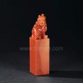 此件芙蓉石通体鲜红明亮,色泽鲜艳,夺人眼目,只在其间以部分黄色相间,质地圆润莹透,雅致非常。方章下方切划平整,上方圆雕一古兽,呈半立姿态,神态略显狰狞,近观可感威严猛然,在简练的刀法下跃然眼前。