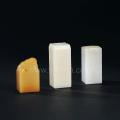 此三件章两件洁白,一件淡枇杷黄,分别饰以博古纹饰或动物纹饰为钮,造型简洁大方,石质通透,颜色淡雅,极具文房雅趣。