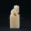 章为汶洋石,呈色洁白无瑕,质地通透,油性极佳、胜似脂玉。圆雕辟邪兽钮,神兽四肢直立、昂首挺胸、侧目而视,神态庄严、孔武有力,大有不怒自威的派势。