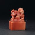 此件芙蓉石所作印章,质地温润,色泽通透,分布均匀,以红为主色调,色彩鲜明。作者以圆雕手法所雕之麒麟,体型丰满,形象生动,身上鳞片刻划细致入微,脚踏浮云,周围亦有瑞云围绕,麒麟作为瑞兽,身负经书,寓意祥瑞。