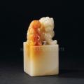 此件方章为汶洋石,凝结雅致,温和细腻,作者以圆朴流畅之手法圆雕呈现古兽钮饰,巧借石材之色差,於暗色调之处雕以“子”,於明色调刻以“母”,所刻古兽神情自然,观之似动,借以材质色层之自然过渡的特征刻画“母子情深”,真可谓匠心独具。
