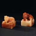 这组套章作者采用传统的方法,刻画较为含蓄,却又不失沉稳。两方印章均采用优质芙蓉石,质地细腻色泽艳丽,其中两方造型统一,四肢盘地,回首狮吼,威风凛凛。美石相配,相得益彰。这组套章可分可合,无论其材质或色彩均为寿山石中稀有上品。