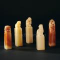 印章五枚,取芙蓉石和高山石材质,白如莹玉,黄似密脂,红显艳泽。一枚以一古兽为钮饰,形态各异,姿势自如,雕工或精细讨巧或顺畅凝练,所刻古兽惟妙惟肖,生动异常,五件如是站立观望,气势古朴,甚为难得。