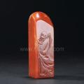 此善伯洞石质地色泽深沉饱满,温和厚重的红色均匀地布满印身,为善伯洞石中最为名贵的李红善伯,质地纯净凝腻,质色相称彰显温婉典雅之气。章体 以薄意技法雕刻达摩立像,达摩目光深邃,凝视远方,身背斗笠,手持木杖,风尘仆仆,仿佛远道而来。人物造型工写结合,头部、手部及斗笠等刻画详细到位,而 衣纹线条则写意传神。底印篆刻“自强不息”,格局方正,篆法苍劲。